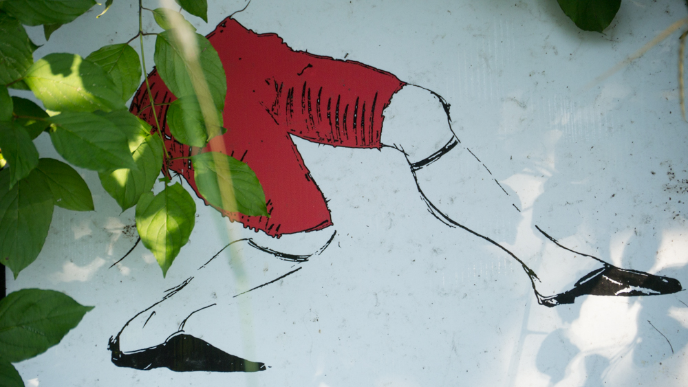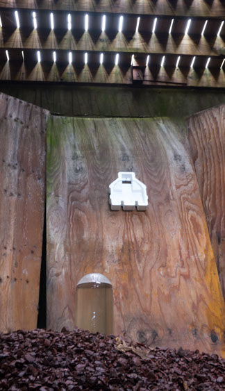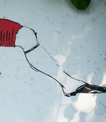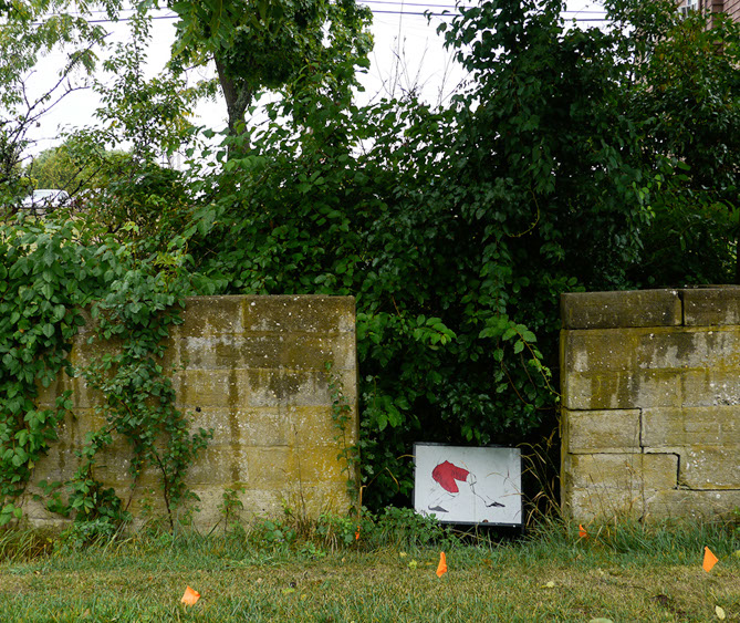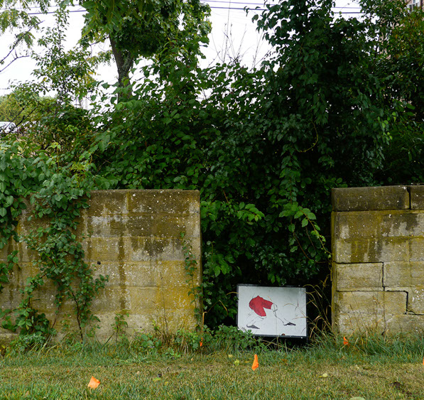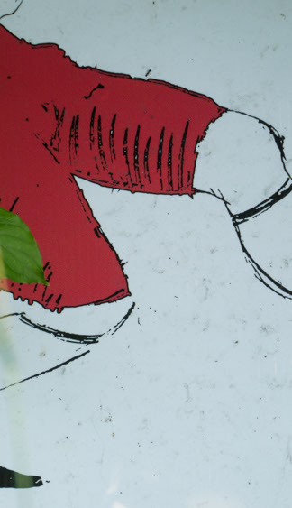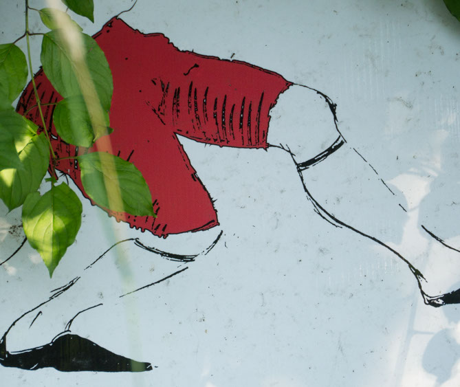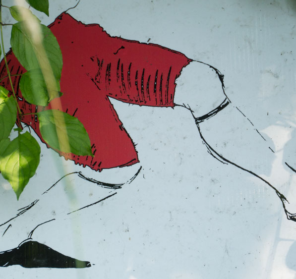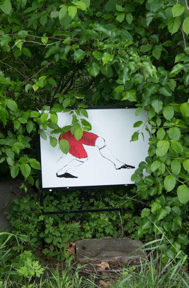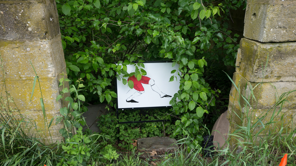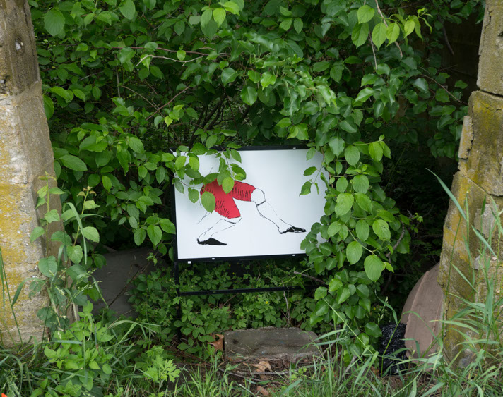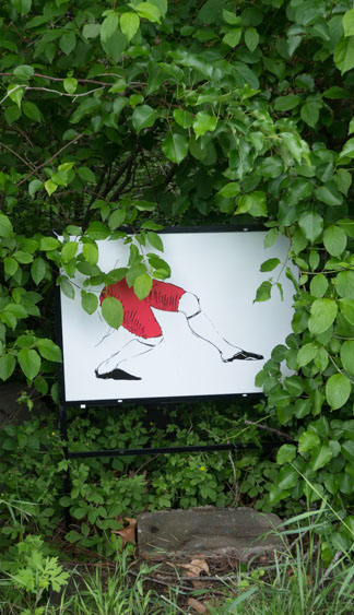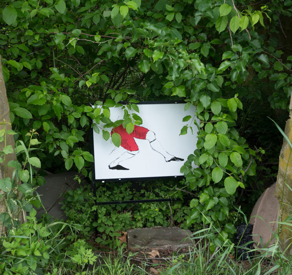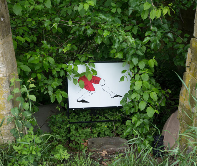 In the decaying foundation of the structure is, "Revolution Pants" - an indoor outdoor drawing in a "for sale sign" tucked into the remaining foundation of a small structure to the left of main building at Artsites. The unknown lower half scutters across the ruins. and is the lead-in to the rough-hewn enclosure under the stairs which can only be viewed from the outside and refer us back to that which is ignored. You have to use binoculars backwards to see some elements. The eau source is a calling back, calling back that sits under the stairs that we use to get higher.