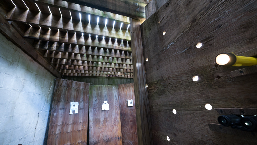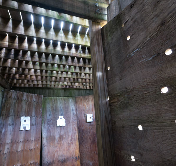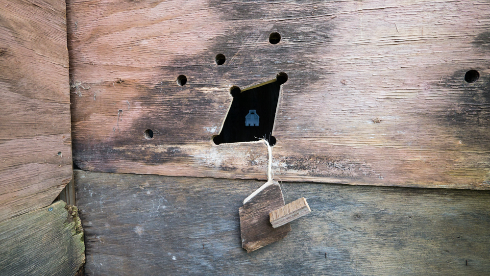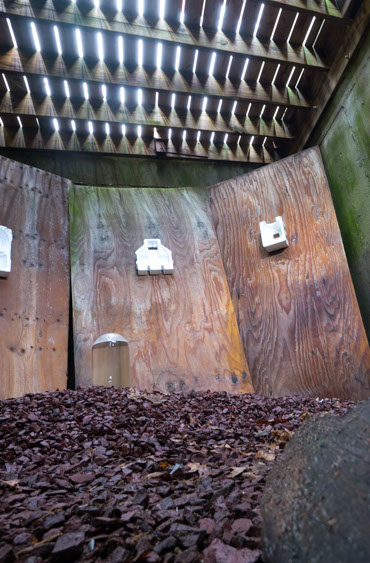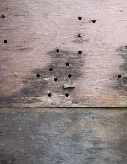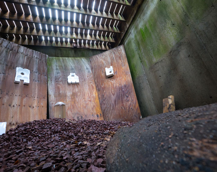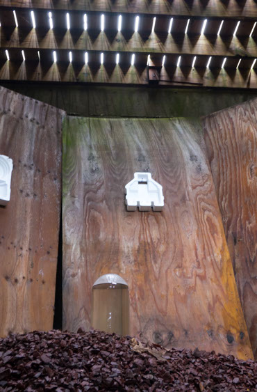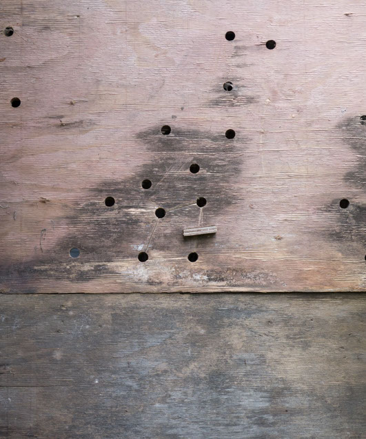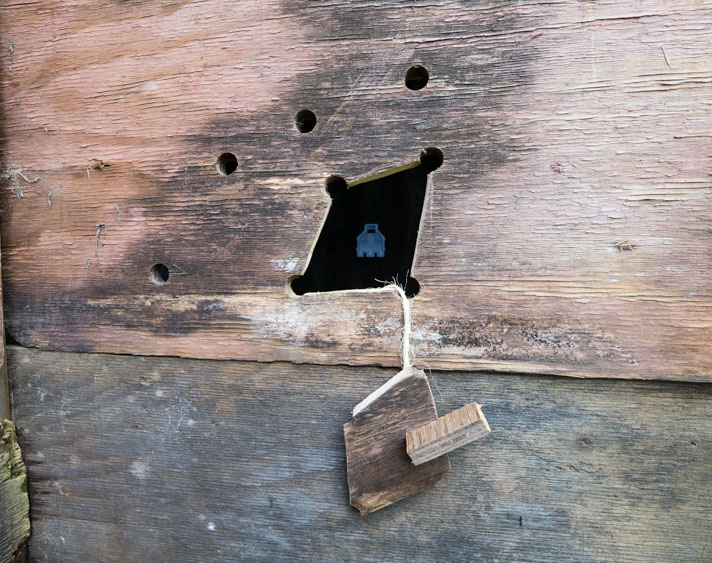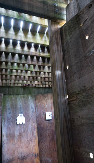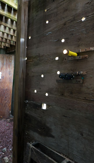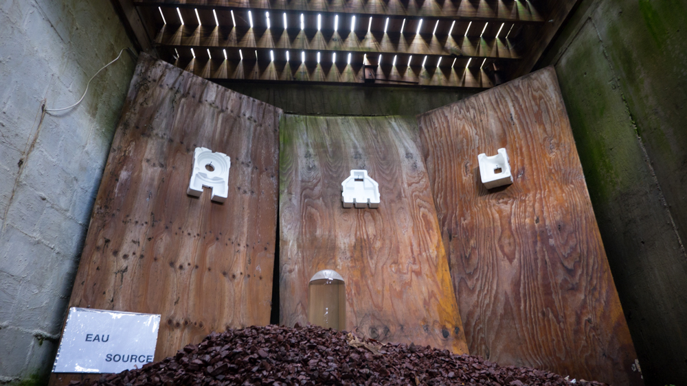 In the decaying foundation of the structure is, "Revolution Pants" - an indoor outdoor drawing in a "for sale sign" tucked into the remaining foundation of a small structure to the left of main building at Artsites. The unknown lower half scutters across the ruins. and is the lead-in to the rough-hewn enclosure under the stairs which can only be viewed from the outside and refer us back to that which is ignored. You have to use binoculars backwards to see some elements. The eau source is a calling back, calling back that sits under the stairs that we use to get higher.
