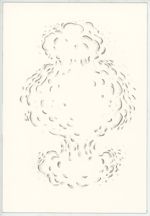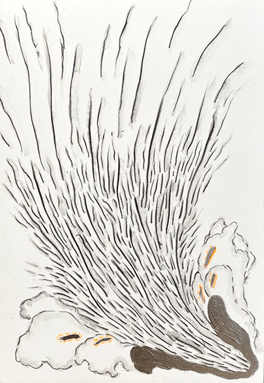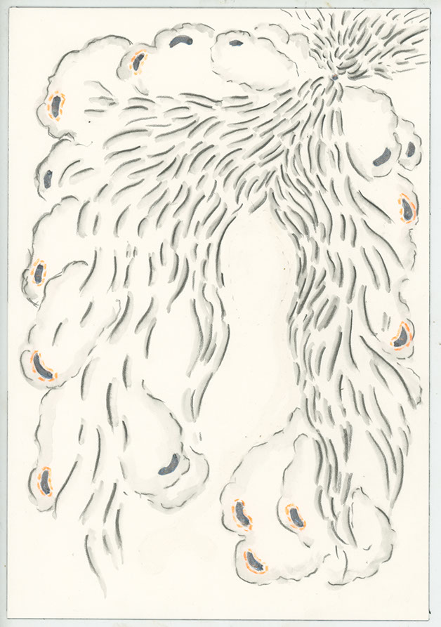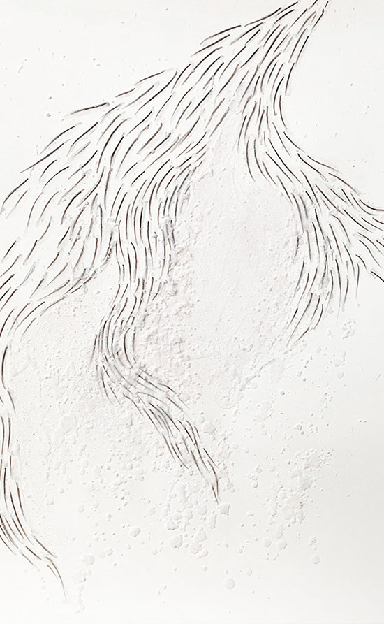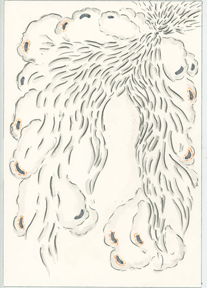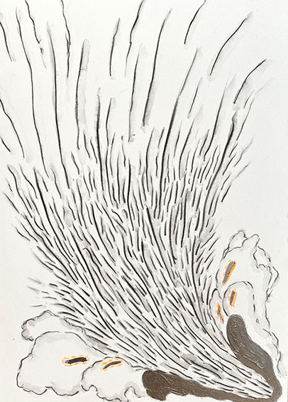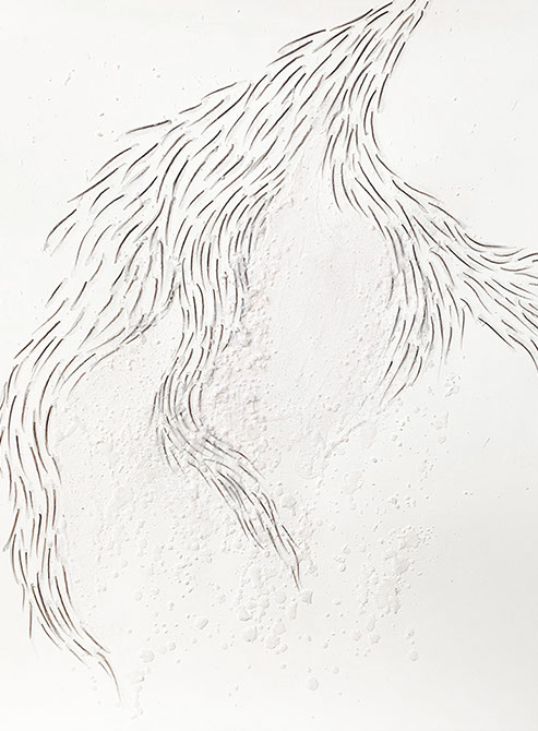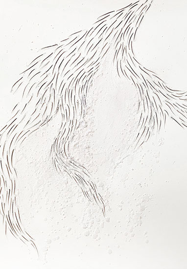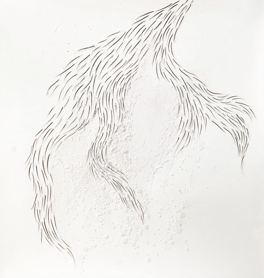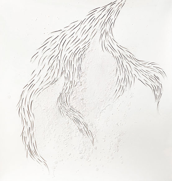 Hairpiece for a Cinematic Alien 2021, graphite, water, brush and flocking, 14 x 11 inches
