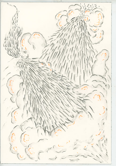 Blam 2021 graphite, wash, brush, neon pencil and slver paint 14 x 11"