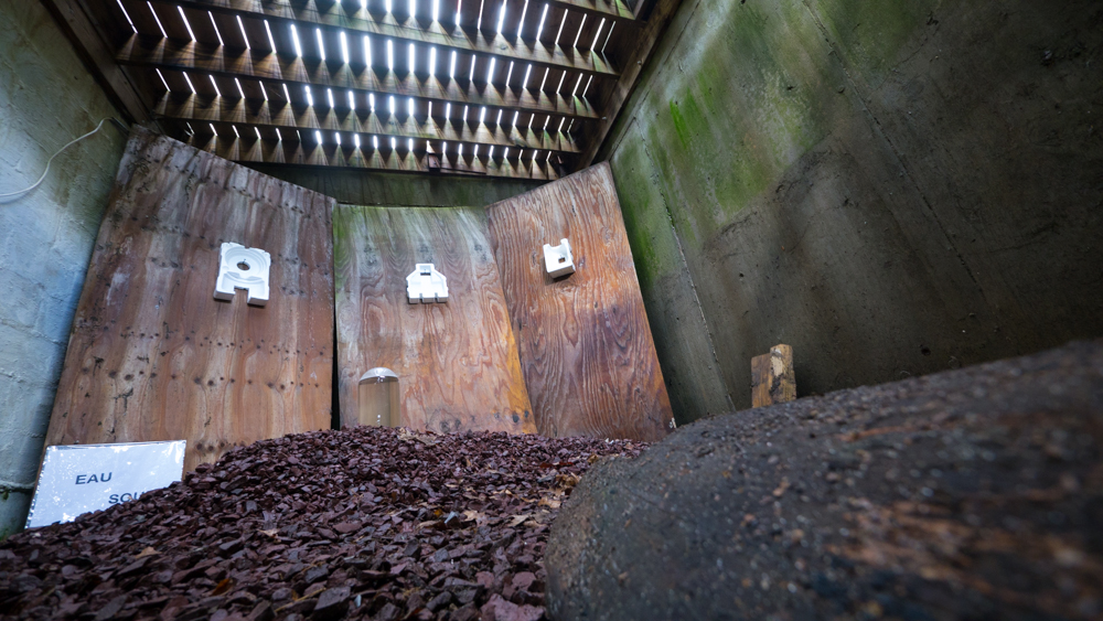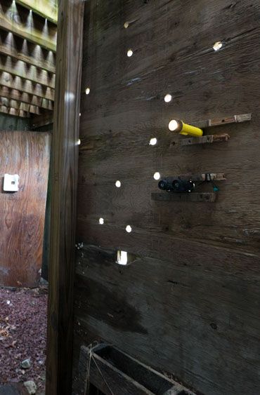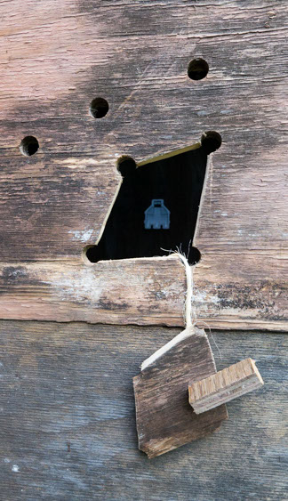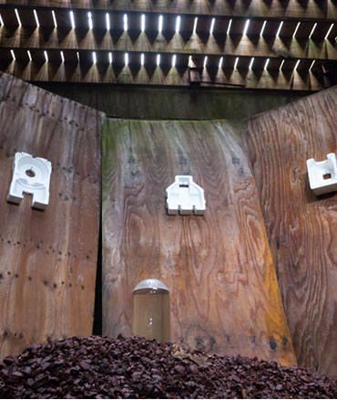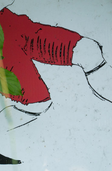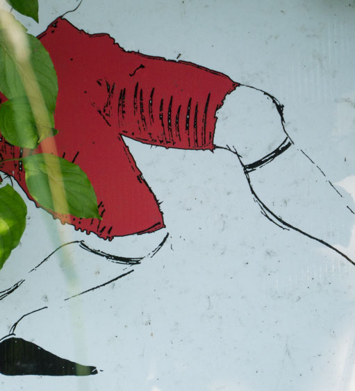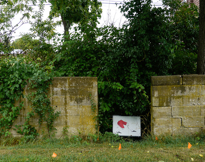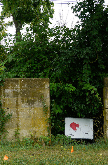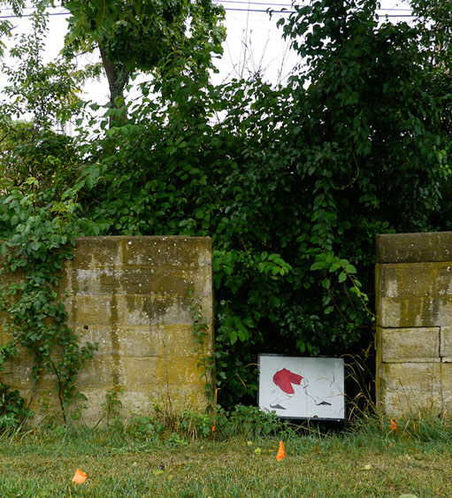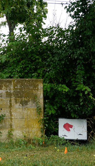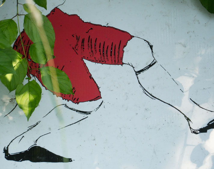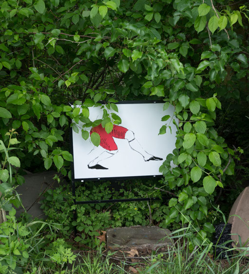 In the decaying foundation of the structure is, "Revolution Pants" - an indoor outdoor drawing in a "for sale sign" tucked into the remaining foundation of a small structure to the left of main building at Artsites. The unknown lower half scutters across the ruins. and is the lead-in to the rough-hewn enclosure under the stairs which can only be viewed from the outside and refer us back to that which is ignored. You have to use binoculars backwards to see some elements. The eau source is a calling back, calling back that sits under the stairs that we use to get higher.