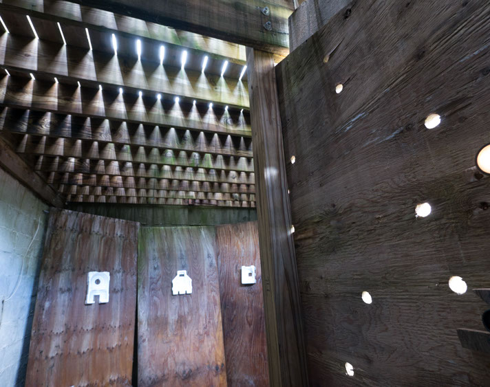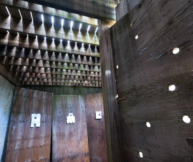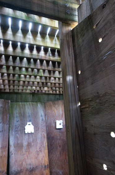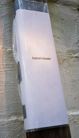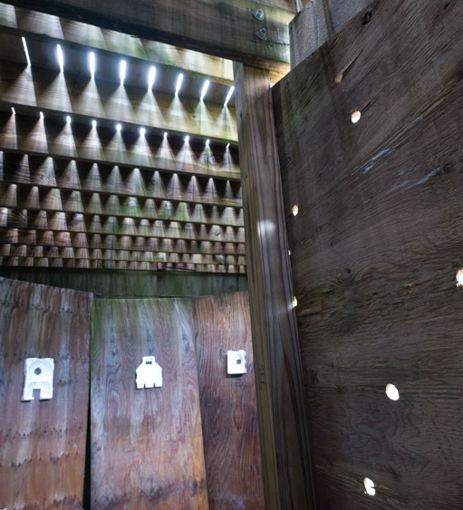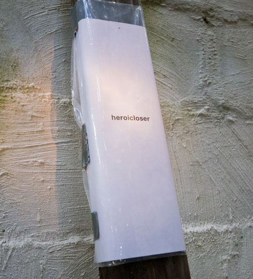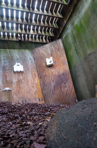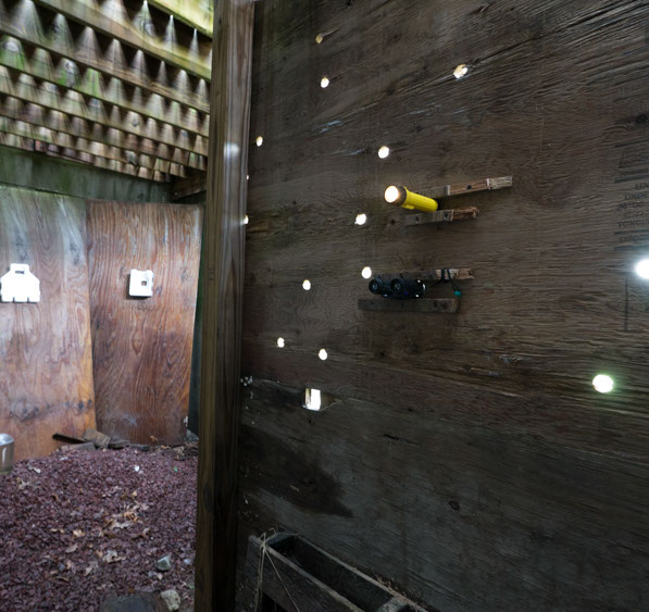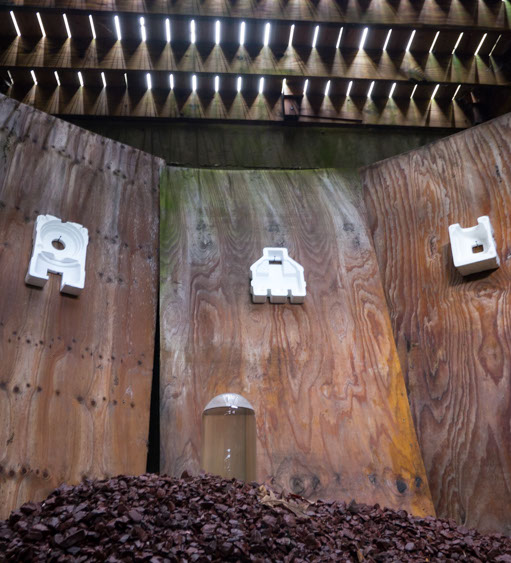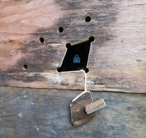 In the decaying foundation of the structure is, "Revolution Pants" - an indoor outdoor drawing in a "for sale sign" tucked into the remaining foundation of a small structure to the left of main building at Artsites. The unknown lower half scutters across the ruins. and is the lead-in to the rough-hewn enclosure under the stairs which can only be viewed from the outside and refer us back to that which is ignored. You have to use binoculars backwards to see some elements. The eau source is a calling back, calling back that sits under the stairs that we use to get higher.
