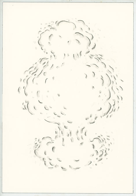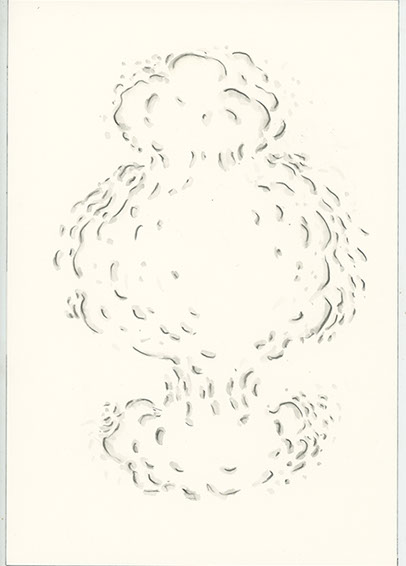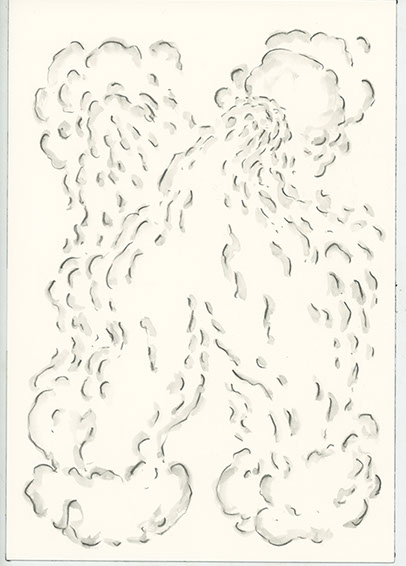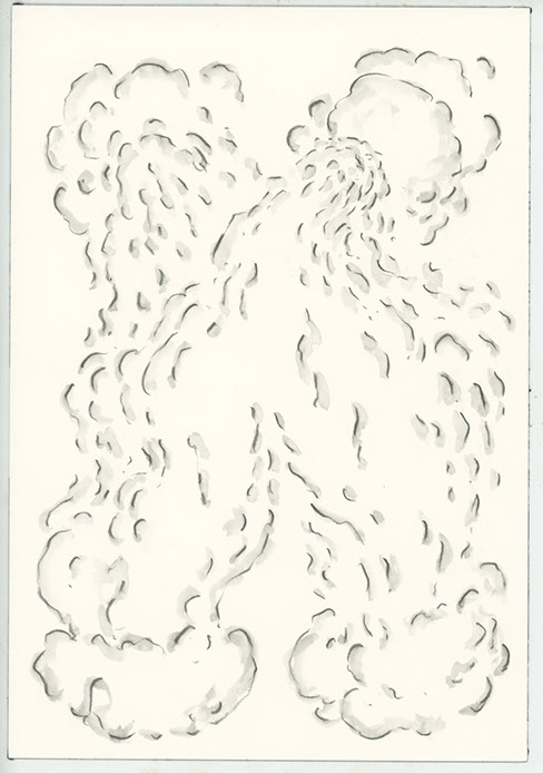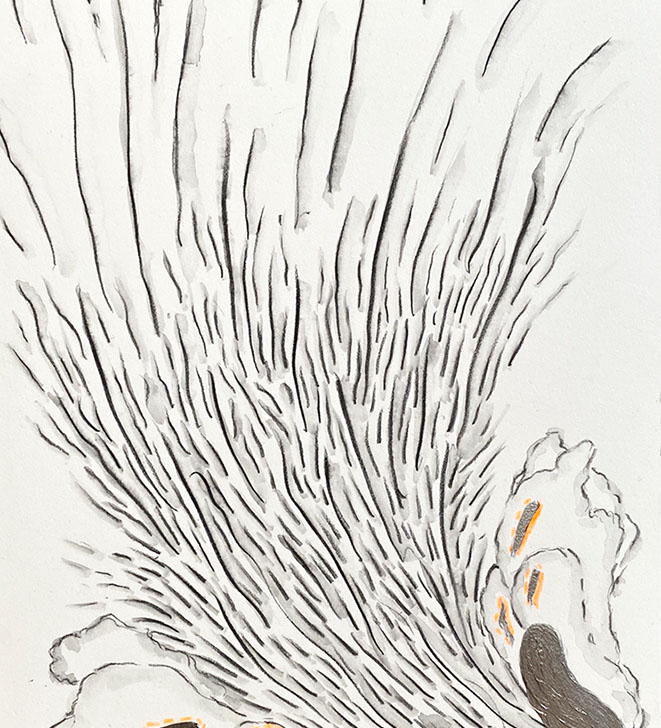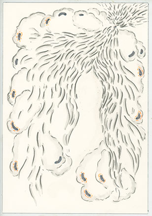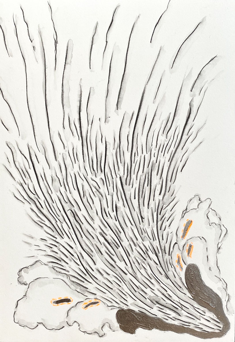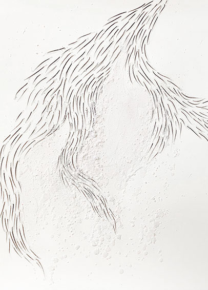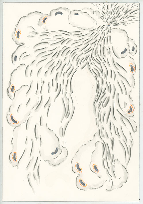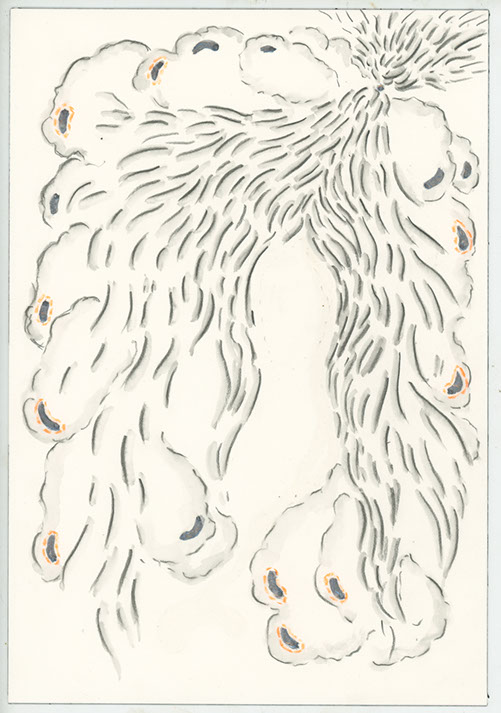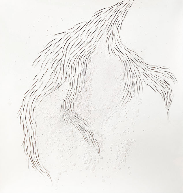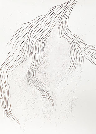 Hairpiece for a Cinematic Alien 2021, graphite, water, brush and flocking, 14 x 11 inches