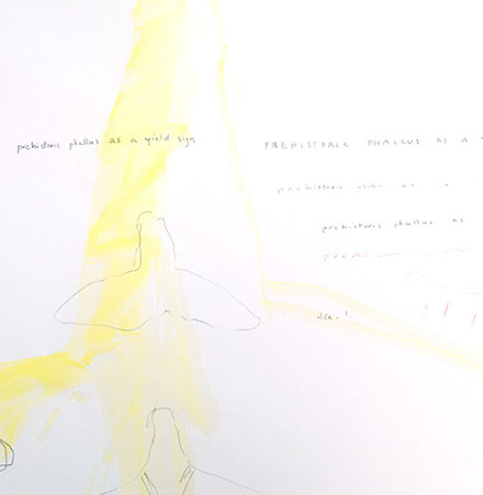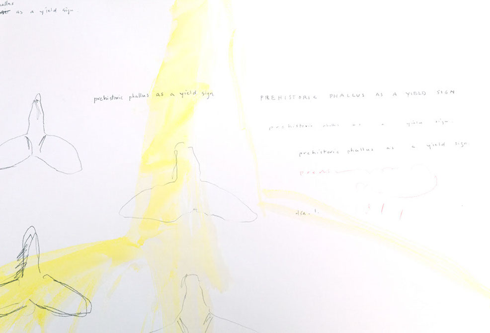 prehistoric phallus as a yield sign, 2014, drawing and waterolor, 24 x 30 inches